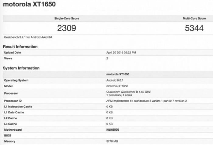 Attraverso l’applicativo lo scorso 20 aprile è stato eseguito un test su un misterioso Motorola XT1650, che dovrebbe essere proprio il Moto X 2016. Attraverso il testo possiamo recuperare alcune informazioni riguardo le specifiche tecniche del prodotto. In primis confermata la presenta del processore Qualcomm Snapdragon 820, ci sono poi anche i 4 GB di memoria RAM ed Android 6.0.1 a bordo.