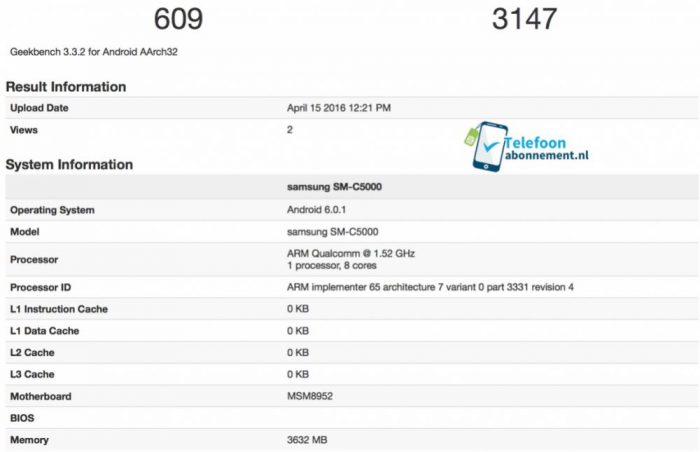 Samsung attualmente produce diversi dispositivi appartenenti alla serie A, E, J, O, S, Note, ed ovviamente questa nuova serie che dovrebbe prendere il nome di Galaxy C. Alcune informazioni sono trapelate su GeekBench che mostra un dispositivo con sigla “Samsung SM-C5000” dotato di queste caratteristiche: schermo da 5.2 pollici, processore Qualcomm Snapdragon 617 octa core, 4 GB di memoria RAM ed Android M 6.0.1.