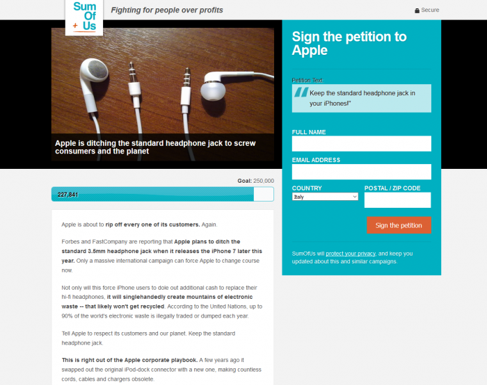 Agli utenti questa decisione non è piaciuta tanto da considerarla una vera e propria follia. Molti utenti vedranno morire tutte le cuffie in dotazione dovendo sborsare qualcosa come altri € 100 per acquistare un apposito adattatore. L’idea è rimasta talmente sul groppone che si è deciso di avviare una vera e propria petizione per cercare di far ragionare Apple. Attualmente è stato quasi raggiunto il traguardo di 250.000 firme, ma la petizione avanza talmente rapidamente che il tutto potrebbe concludersi in brevissimo tempo. Chiaro segno di malcontento da parte degli utenti?