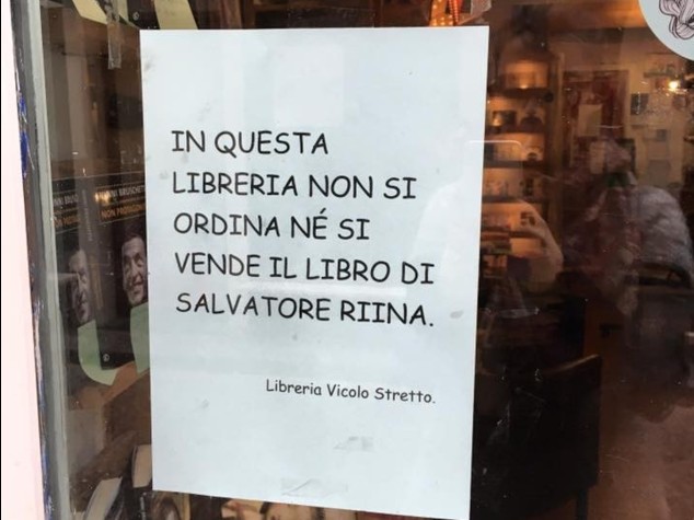 Il cartello, che è stato esposto dalla libreria Vicolo Stretto ed è stato pubblicato anche sulla pagina Facebook del bookstore, recita testualmente “In questa libreria non si ordina, né si vende il libro di Salvatore Riina.”