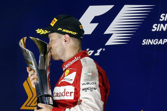 Sebastian Vettel trionfa al GP di Singapore con la Ferrari. Terzo Raikkonen, dietro alla RedBull di Daniel Ricciardo. Rosberg solo quarto, mentre la Mercedes di Hamilton, a sorpresa, si ritira