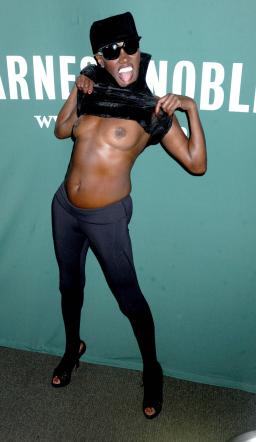 Grace Jones, scatenata e immancabilmente sexy alla presentazione della sua prima fatica letteraria, davanti ai flash dei fotografi e dei paparazzi che non cessavano mai di scattare, si è esibita in un topless improvvisato ma molto provocante, sollevandosi la maglietta e scoprendo i seni nudi e perfetti (anche se la maglietta li lasciava già intravedere).