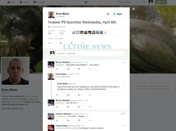 Secondo il grande Evan il dispositivo dovrebbe arrivare precisamente il giorno 6 aprile, che dovrebbe essere di mercoledì. Il dispositivo non è di certo troppo lontano e con già Samsung Galaxy S7 ed LG G5 sul campo non tarderà ad arrivare. Tuttavia credete sia davvero plausibile aspettarlo tra meno di un mese? Considerando che anche HTC One M10 dovrebbe arrivare nel corso del prossimo mese evidentemente Huawei non vuole farsi superare anche da HTC.
