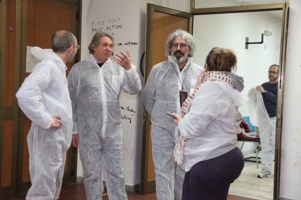 SALENTO-La vera azione di protesta non è scrivere i muri, ma ripitturarli. Con questo slogan, il rettore dell’Università del Salento ha guidato la protesta degli studenti di Lecce, ma anche degli insegnanti, dei membri dello staff amministrativo e di semplici cittadini, che indossate le tute bianche, hanno ripulito Palazzo Codacci-Pisanelli.