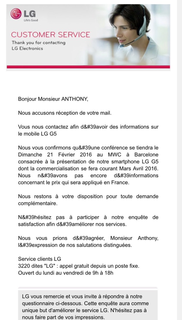 L’utente avrebbe ricevuto una mail da parte del custom service di LG in cui si parlerebbe dell’evento organizzato per il prossimo 21 febbraio e del nuovo top gamma della casa. Questo, sempre stando alla mail, dovrebbe essere commercializzato intorno al periodo marzo/aprile. Naturalmente prendete tutto con la dovuta cautela, potrebbe essere un fake, anche se il periodo ci sta.
