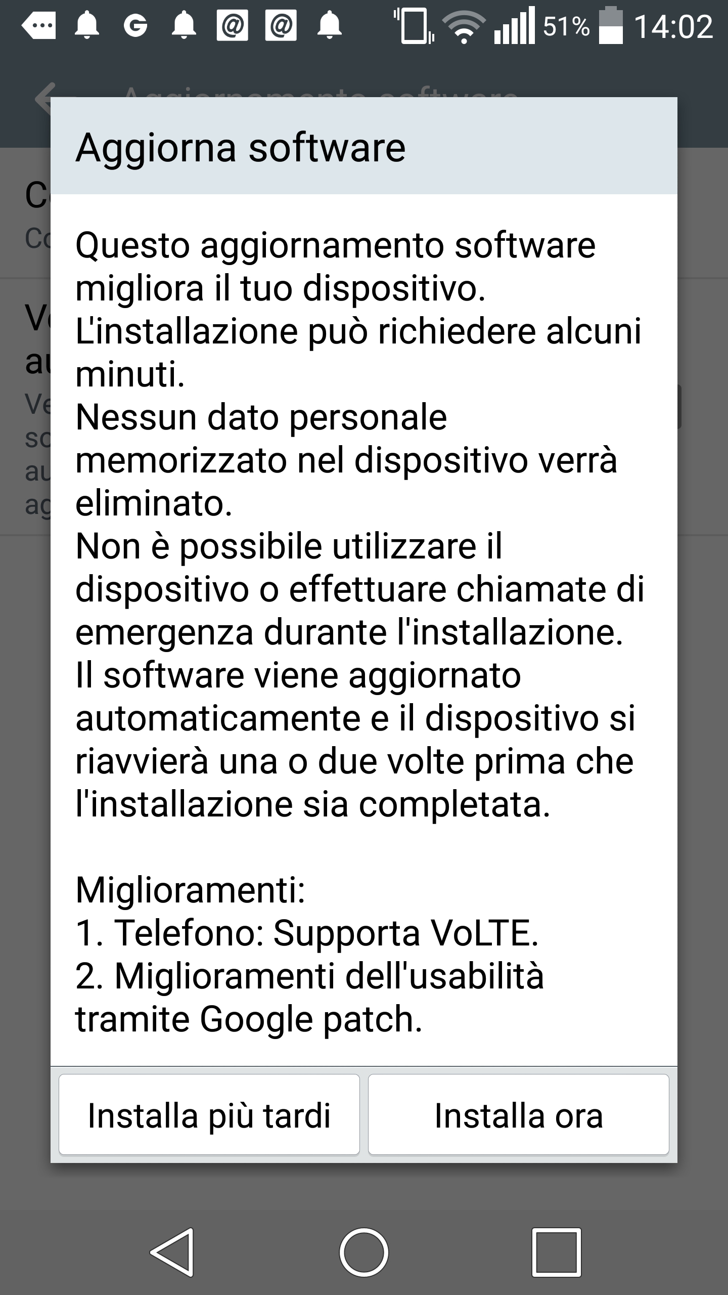 Il changelog è chiaro, il telefono ora supporta la funzione delle chiamate VoLTE anche se sono state già introdotte in precedenza, pensiamo quindi a qualche bugfix, ed è stata risolta la problematica legata a StageFright. Procedete pure tranquillamente al download.