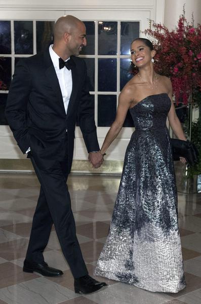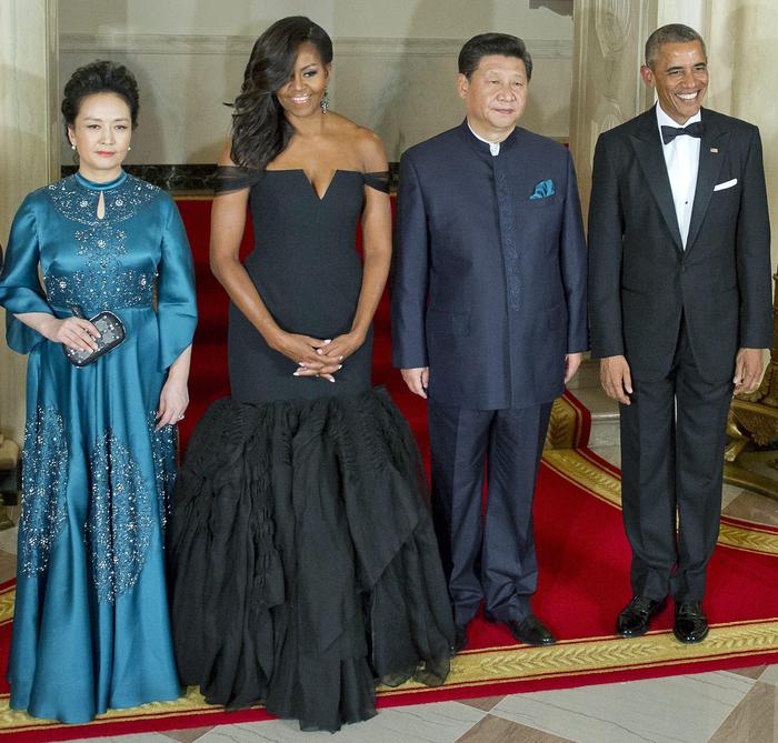 Michelle Obama indossava un abito lungo e nero, con le spalle scoperte e balze di tulle, un modello firmato Vera Wang. Accanto a lei c’era la moglie del premier cinese, Peng Liyuan, che vestiva invece una creazione cinese di seta blu impreziosita da ricami e da perline.