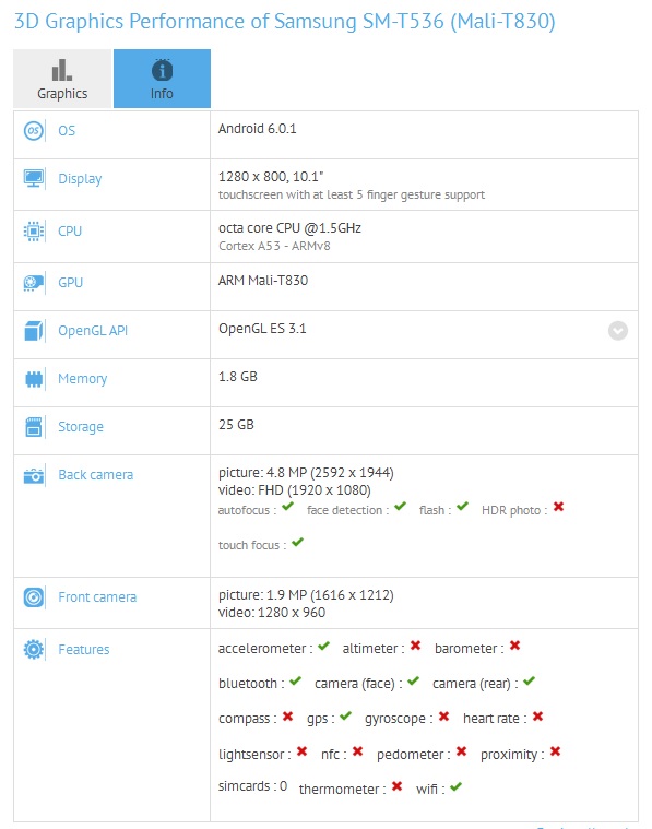 Il dispositivo, che è comparso nei database riassuntivi di GFXBench, viene riconosciuto con la sigla SM-T536 e dispone di un display di grandi dimensioni, precisamente 10.1 pollici con risoluzione HD 1280 x 800 pixel. C’è poi un processore Octa Core Cortex-A53 settato a 1.5 GHz a muovere in sistema insieme al supporto di 2 GB di RAM.