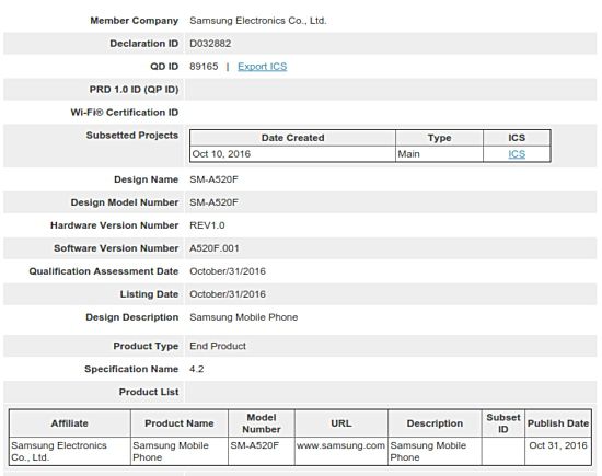 Samsung Galaxy A5 2017 viene certificato