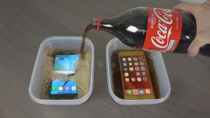Sono molte le persone che utilizzano la Coca Cola per pulire, infatti la bibita è molto corrosiva, per cui a qualcuno è venuta la brillante idea di inzuppare i due top di gamma in due recipienti pieni di bibita in modo da vedere cosa sarebbe successo e, soprattutto, chi ne sarebbe sopravvissuto.