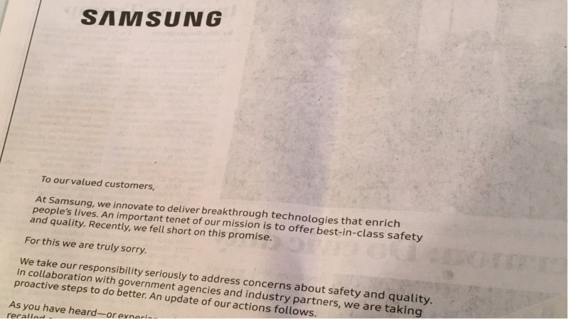 Samsung ha pubblicato le sue scuse sui maggiori giornali statunitensi come il Wall Street Journal ed il New York Times. L’azienda ha acquistato degli spazi pubblicitari su queste testate, al posto della pubblicità ha pubblicato una lettera di scuse molto dettagliata chiedendo ancora venia per Note 7.
