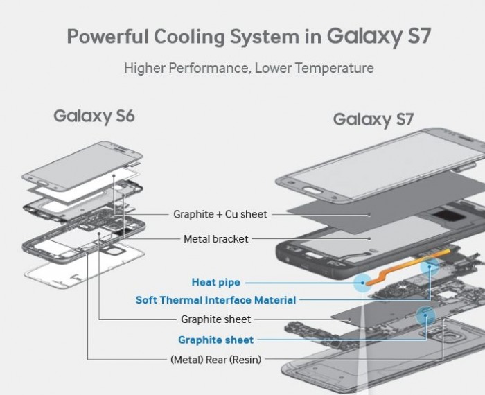 Visto lo spessore e le dimensioni di S7, Samsung ha avuto fin da subito difficoltà nel ricercare ed adattare un dissipatore all’interno del device. Il progetto è partito fin dalle prime fasi di progettazione e da subito gli ingegneri si sono messi sotto per cercare la soluzione migliore. Il dissipatore, per essere compatibile, aveva bisogno di un diametro dei canali di massimo 0.4 mm, e le soluzioni erano talmente tante che se la son dovuti praticamente cavare da soli.