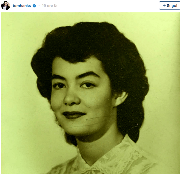 “Questa donna bellissima è mia madre”, così, con una sua foto da giovane, il famosissimo attore Tom Hanks annuncia sul social Instagram la morte della sua amatissima mamma. “Ha cambiato la vita in meglio a moltissime persone – scrive ancora l’attore – Oggi dobbiamo dirle addio. Ci rivedremo dall’altra parte mamma”.