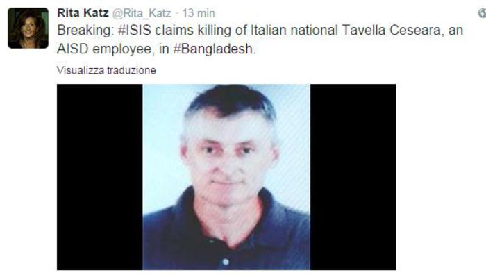 A comunicarlo su Twitter la direttrice del Site, Rita Katz. Cesare Tavella sarebbe stato crivellato di colpi nel quartiere diplomatico di Dacca (Bangladesh) da tre uomini armati a bordo di una moto. L’attentato è stato rivendicato dall’Isis