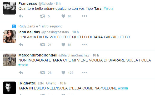 Tara GabrielettoNon sono mancati gli insulti pesanti a Tara, soprattutto quando è stata inquadrata dalle telecamere de l’Isola dei Famosi 2016: sui social è stato davvero scritto di tutto, dagli insulti fino ai commenti sul fatto che il comportamento dell’ex corteggiatrice sia un vero affronto nei confronti di Maria de Filippi e che non doveva più entrare in uno studio Mediaset.