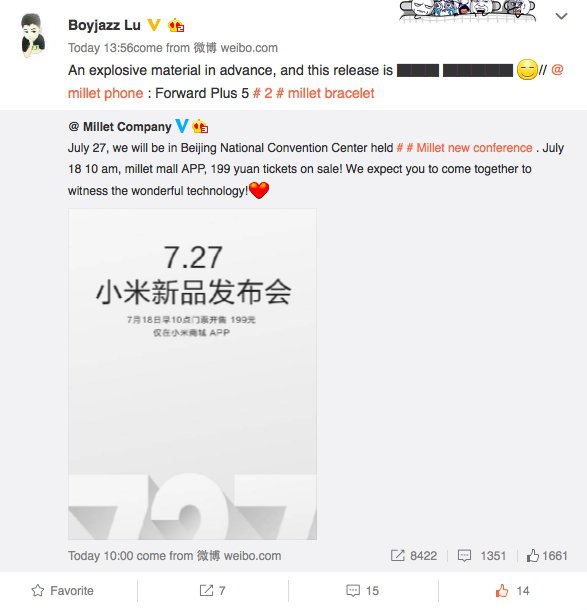 Il 27 luglio quali dispositivi potrebbero arrivare? Tra i più attesi c’è certamente il nuovo Xiaomi Redmi Note 4, ma grazie ad ulteriori dettagli possiamo anche immaginare quali prodotti saranno presentati. Si parla nel post di ben 2 prodotti, il primo sarà composto da un nome a 3 lettere, il secondo da 4.